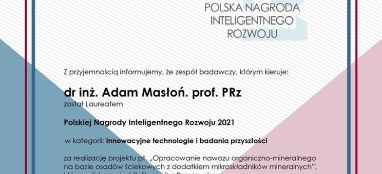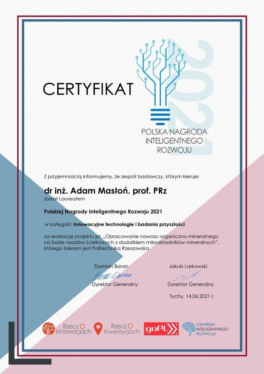 Zespół badawczy z Politechniki Rzeszowskiej, pod kierownictwem dr inż. Adama Masłonia, prof. PRz, został laureatem Polskiej Nagrody Inteligentnego Rozwoju 2021 w kategorii "Innowacyjne technologie i badania przyszłości" za realizację projektu pt. "Opracowanie nawozu organiczno-mineralnego na bazie osadów ściekowych z dodatkiem mikroskładników mineralnych"